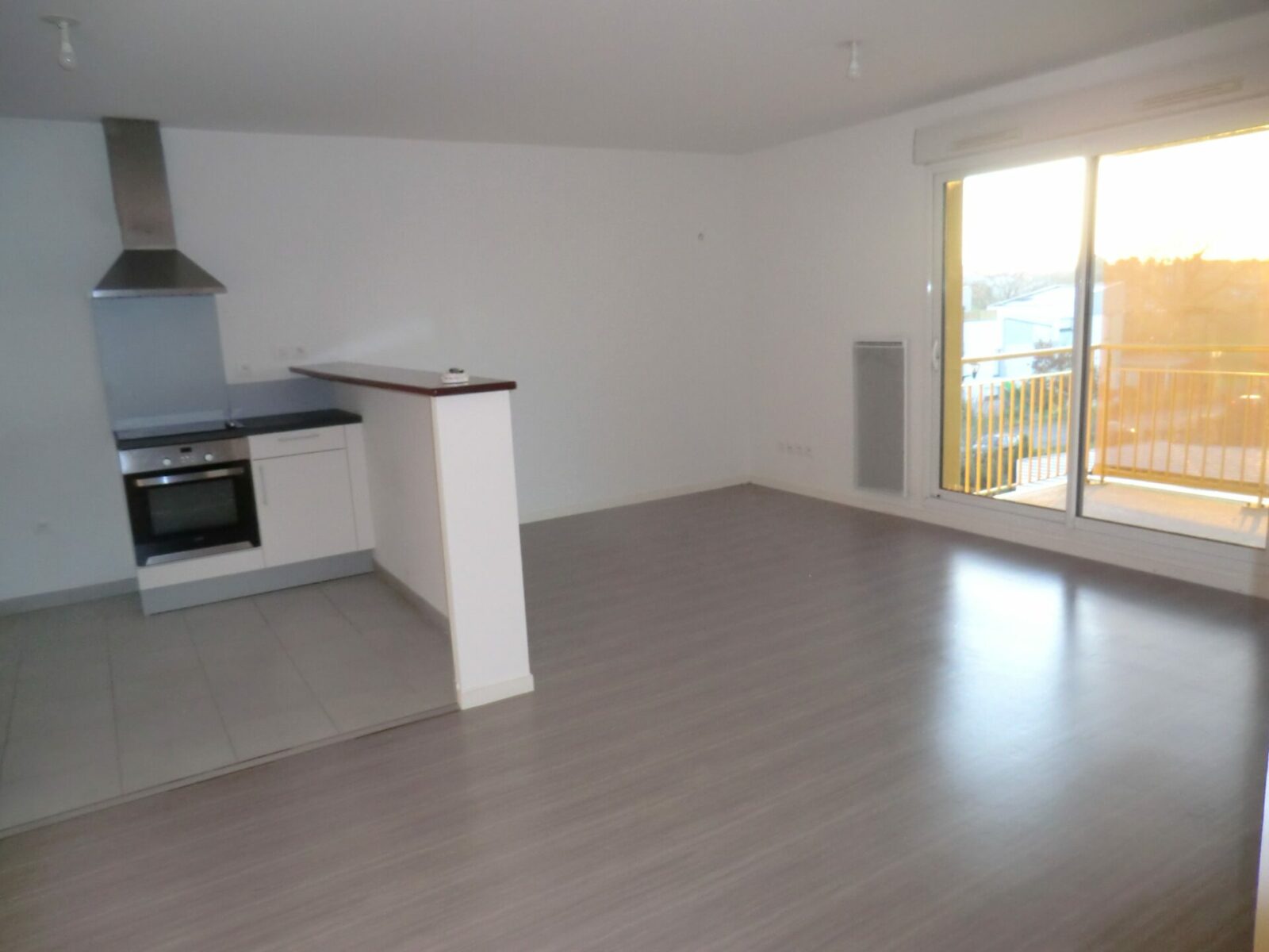 Cet appartement dispose d’une entrée, d’un séjour avec cuisine équipée et aménagée (plaques, four et hotte), d’un balcon de 5,71m², de deux chambres dont une avec placard, d’ une salle de bains et d’un wc.