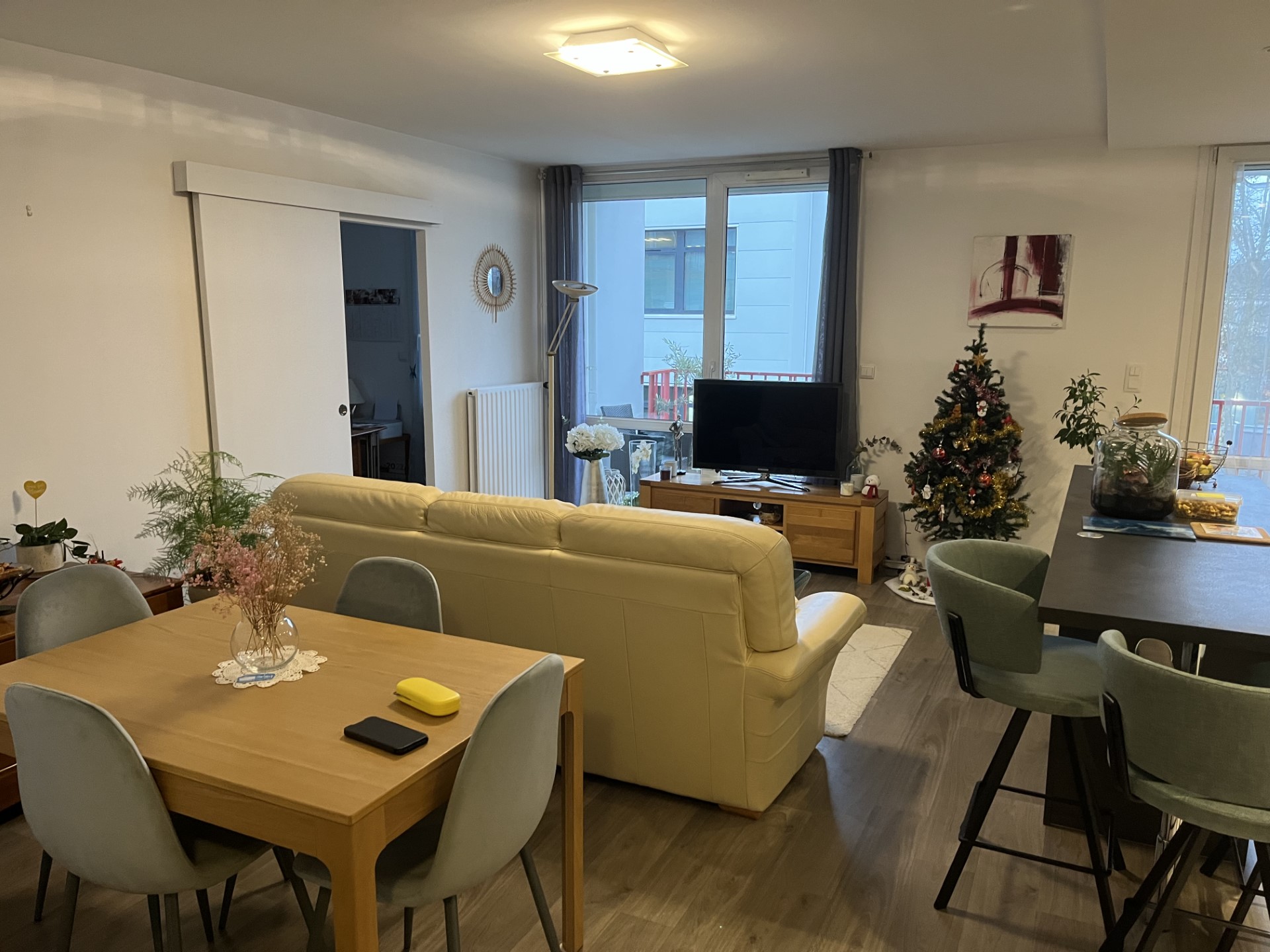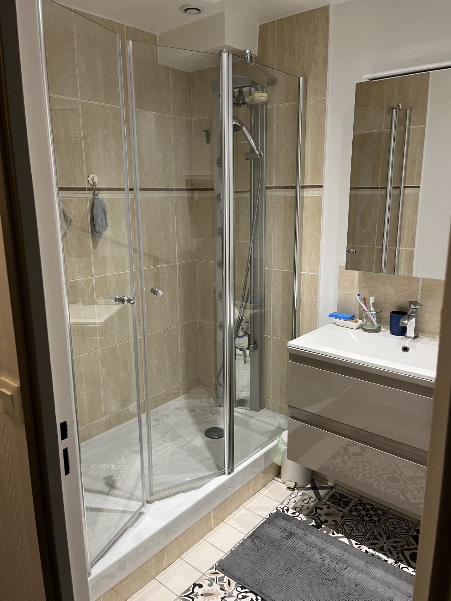 Cet appartement dispose d’une entrée avec placard, d’un séjour avec cuisine équipée aménagée (four, plaques, hotte et lave-vaisselle), d’un balcon, d’un bureau avec placard, d’une chambre avec placard et d’une chambre avec placard-balcon et salle d’eau, d’une salle d’eau, d’un wc, d’une cave et d’un garage.